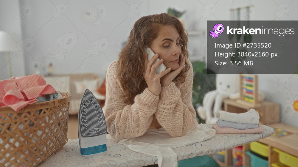 Woman talking on phone in cozy home laundry room, focusing on ironing clothes with a basket and iron on the board, creating a casual and warm domestic atmosphere. - Kraken Images