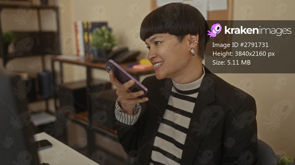 Woman talking on phone in office setting with stylish hair and earrings, surrounded by books and plants, reflecting a modern workspace atmosphere.
