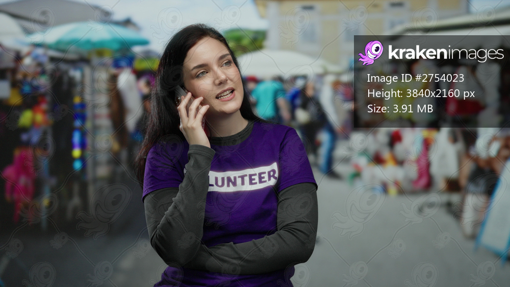 Woman talking on phone in outdoor market setting wearing volunteer shirt surrounded by people illustrating community interaction and engagement.