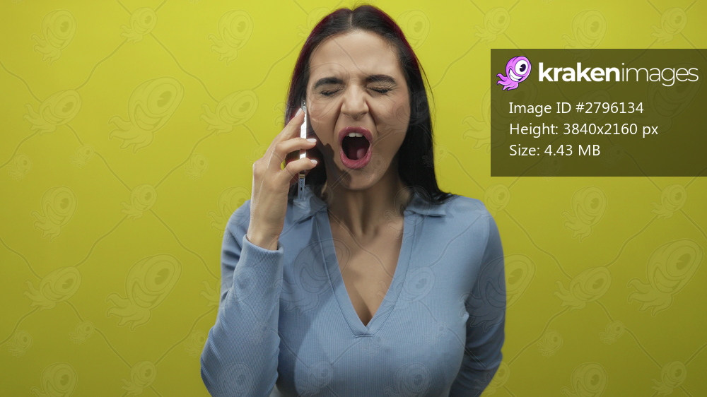 Woman talking on phone with intense expression against a vibrant yellow wall, wearing a blue shirt, capturing a moment of frustration and communication. - Kraken Images