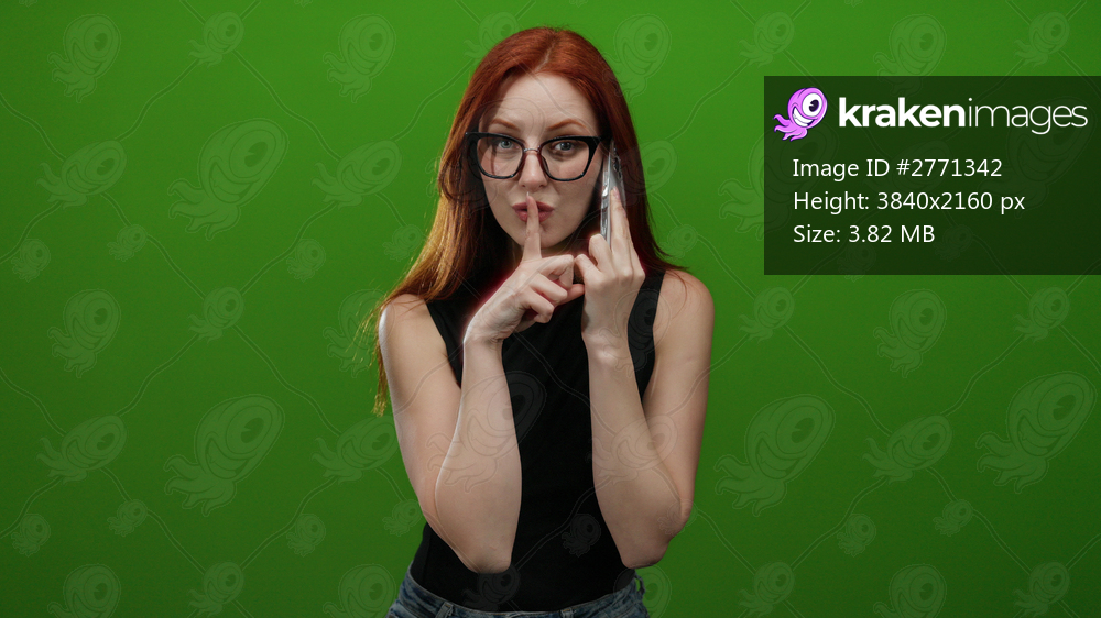 Woman talking on phone with red hair makes shushing gesture against green wall, showcasing adult female communication.