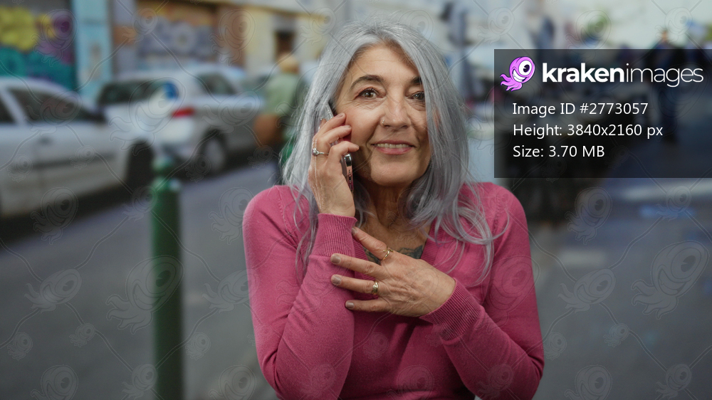 Woman talking on phone with smiling expression in urban street setting showing senior woman with grey hair and pink sweater outdoors in casual environment. - Kraken Images