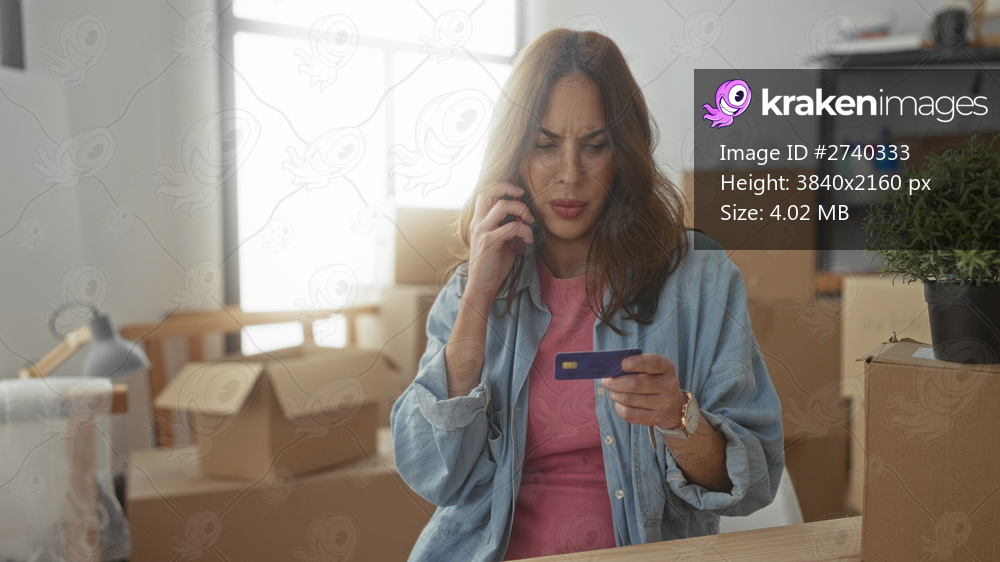 Woman talking on phone while holding credit card in new home with moving boxes around suggests a busy hispanic female managing finances indoors.