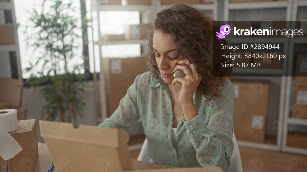 Woman talking on phone while packing cardboard parcel at a delivery desk in a warehouse style building surrounded by boxes; small business busy.