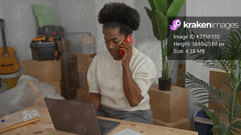 Woman talking on phone while using laptop in living room filled with boxes indicating recent move to new home