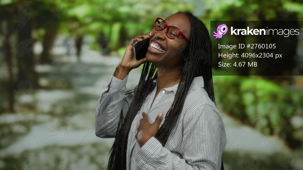 Woman talking on smartphone in outdoor park setting, wearing glasses and striped shirt amidst lush green background enjoying conversation