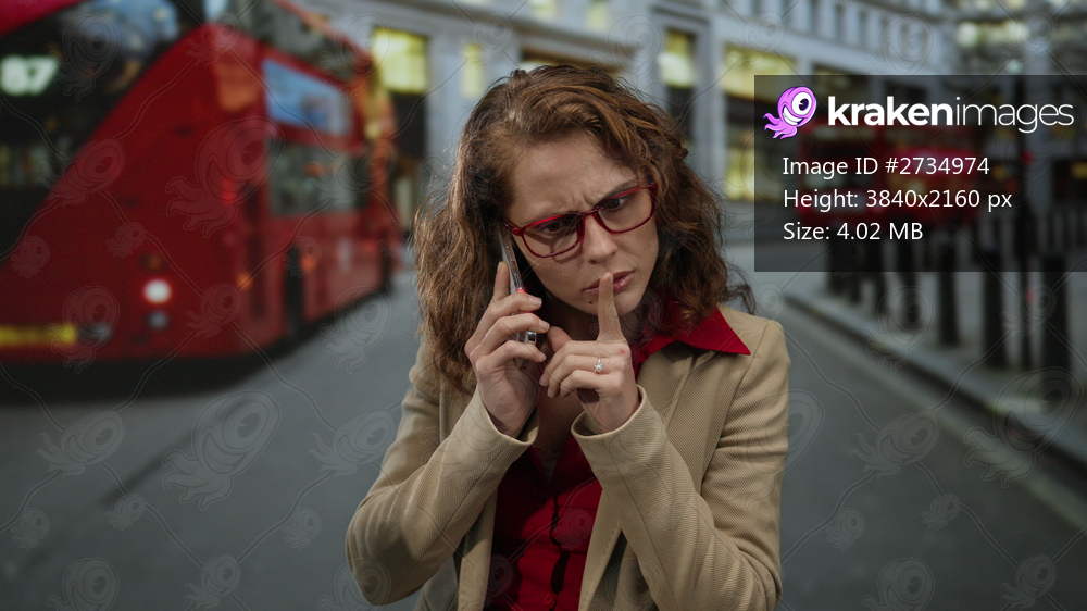 Woman talking on smartphone in urban street with double-decker buses passing by in a busy city environment, showcasing a blend of modernity and tradition. - Kraken Images