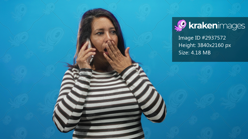 Woman talking on smartphone, smiling while holding phone to ear with hand near mouth, striped shirt clearly visible in blue studio; surprise connection warmth. - Kraken Images