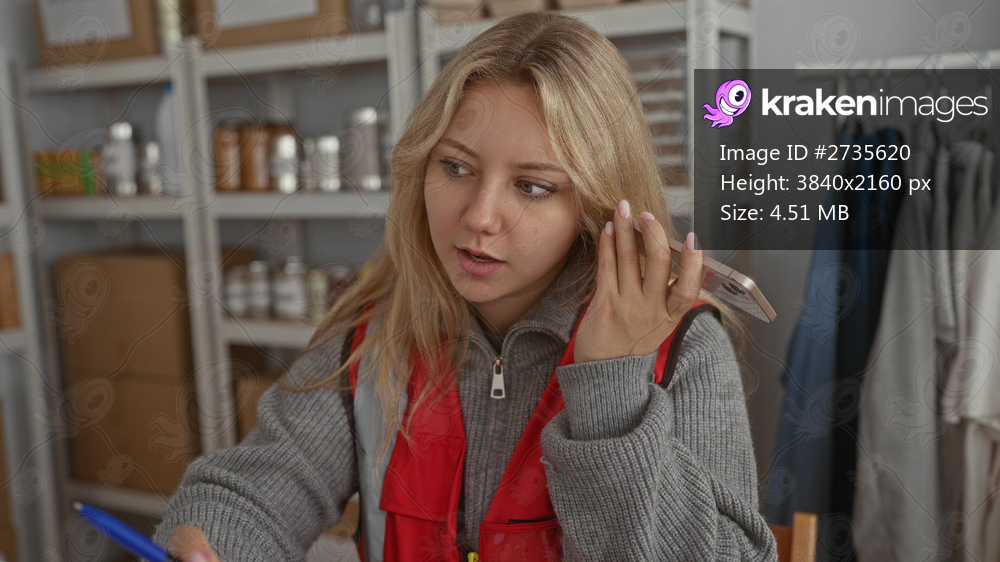 Woman talking on smartphone wearing red vest in donation center with shelves filled with supplies, showcasing volunteer activity in an indoor charity setting. - Kraken Images