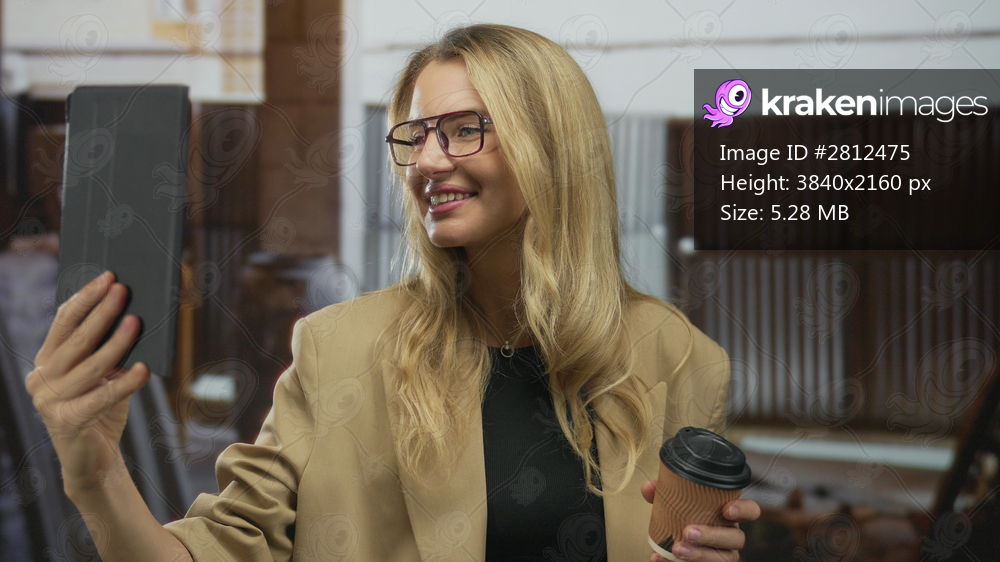Woman talking on tablet at construction site holding coffee smiling wearing blazer and glasses symbolizing modern communication and work environment indoors. - Kraken Images