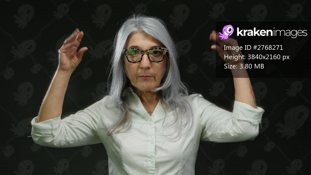 Woman talking passionately with expressive gestures, grey hair and glasses, isolated against a black background, conveying emotion and engagement.