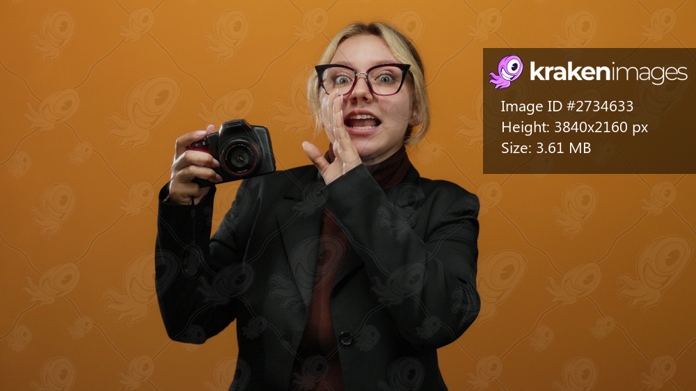 Woman talking secretly holding camera against orange wall, wearing glasses and black coat, blonde hair, expressing surprise, isolated setting, vibrant background.