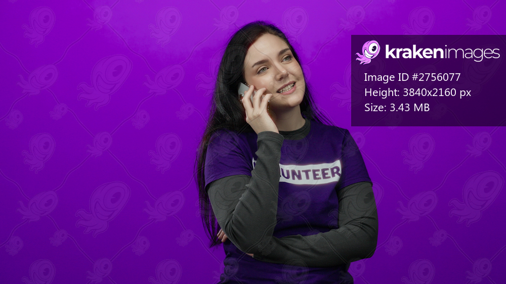 Woman talking smartphone volunteer shirt brunette purple background calling female communication isolated cheerful outdoors person happy cheerful background.