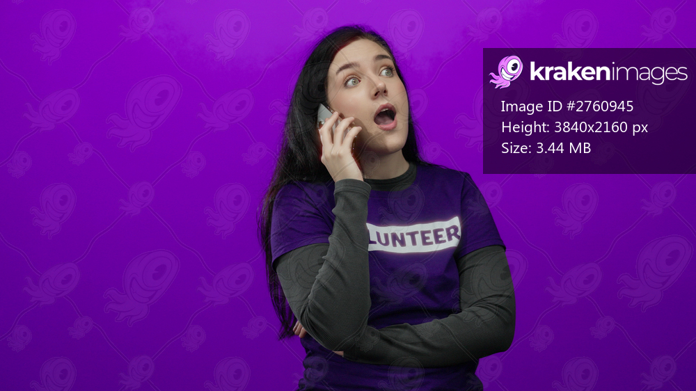 Woman talking smartphone volunteer shirt brunette purple background calling female communication isolated cheerful outdoors person happy cheerful background.