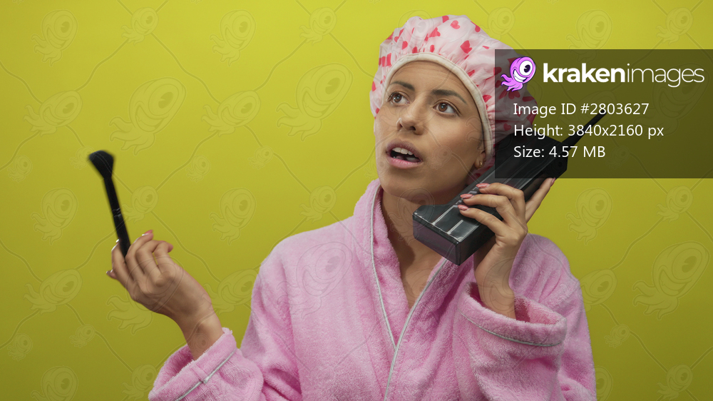 Woman talking vintage phone wearing pink bathrobe and heart shower cap holding makeup brush against bright yellow wall.