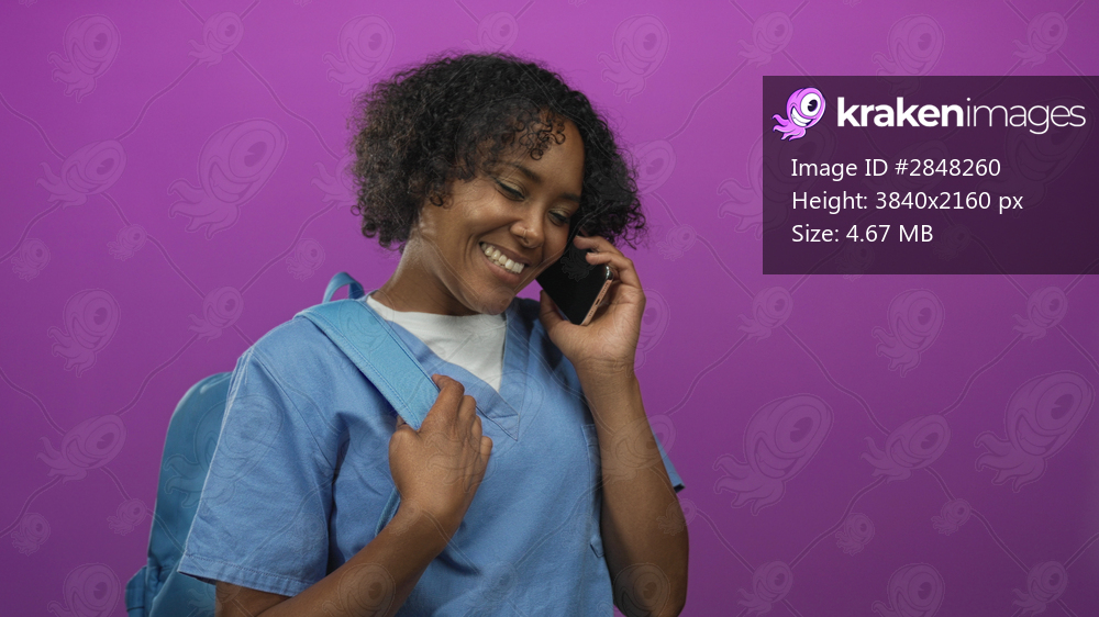 Woman talks on smartphone in studio while gently holding a backpack strap against a purple backdrop; joy.