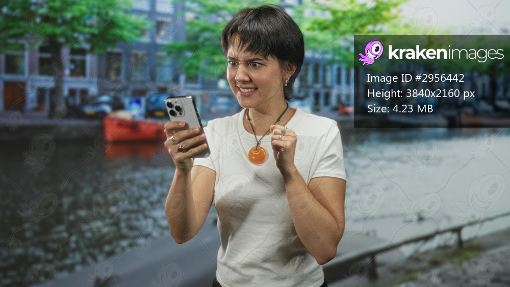 Woman tapping smartphone with both hands, smiling and leaning forward on street by a canal with boats and riverside buildings while wearing a pendant and rings; joy connection. - Kraken Images