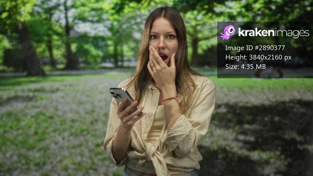 Woman tapping smartphone with fingers in forest clearing, mouth slightly open while standing in green outdoors; surprise curiosity discovery.