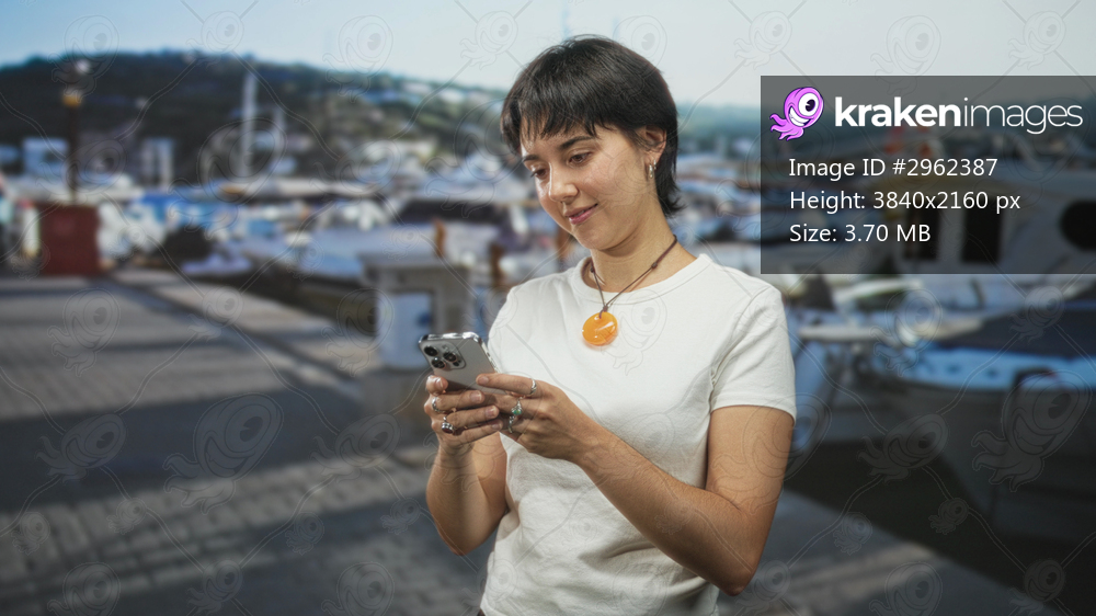 Woman tapping smartphone with fingers and smiling, orange pendant visible on a dock with moored boats by a street; serene ease.