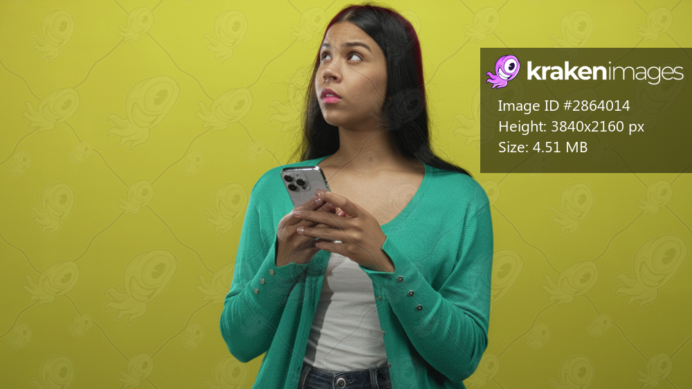 Woman tapping smartphone with focused gaze in yellow studio wearing teal cardigan and white top; curiosity.