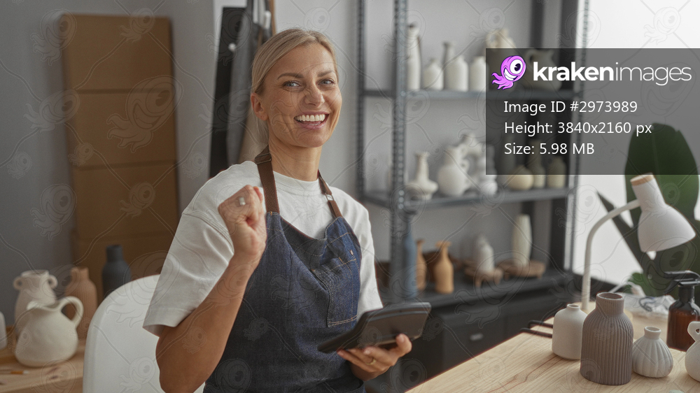 Woman tapping smartphone with hand in pottery studio, checking a payment and making a small fist gesture of success; small business success satisfaction. - Kraken Images
