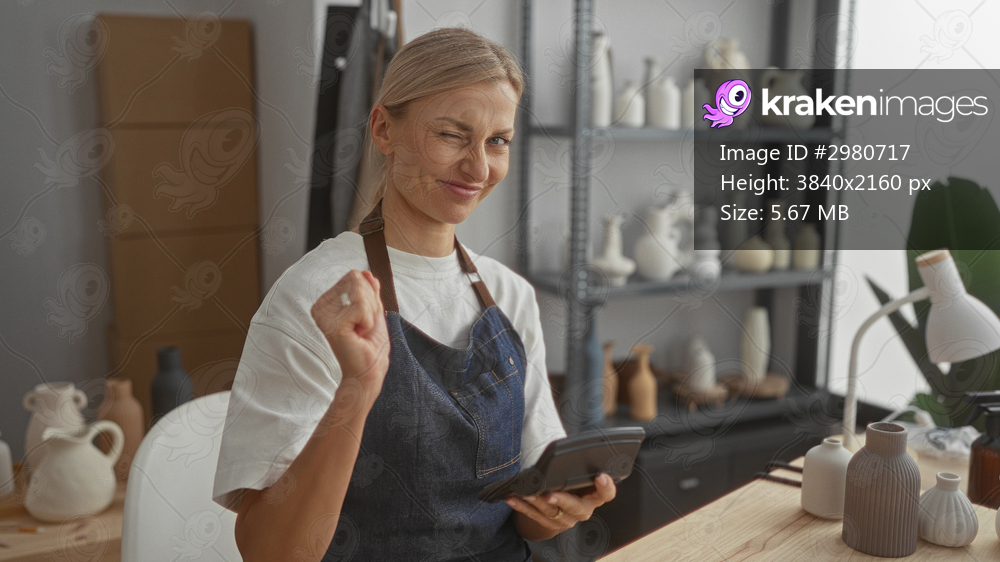 Woman tapping smartphone with hand in pottery studio, checking a payment and making a small fist gesture of success; small business success satisfaction. - Kraken Images