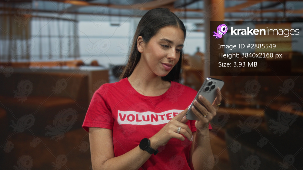 Woman tapping smartphone with hands in a restaurant building while wearing volunteer tee and smartwatch; calm concentration.