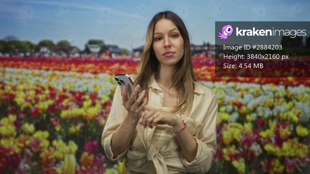 Woman tapping smartphone in studio tulip field with visible hands and casual shirt, standing among blurred blossoms; serenity.