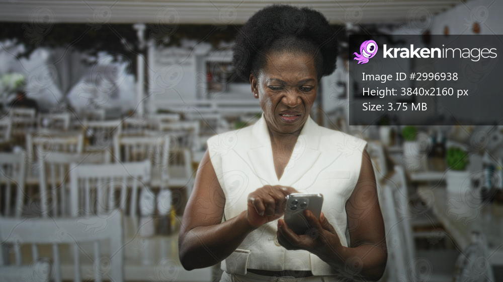 Woman tapping smartphone with index finger in quiet restaurant, grimacing with furrowed brow and pursed lips; frustration technology issue.