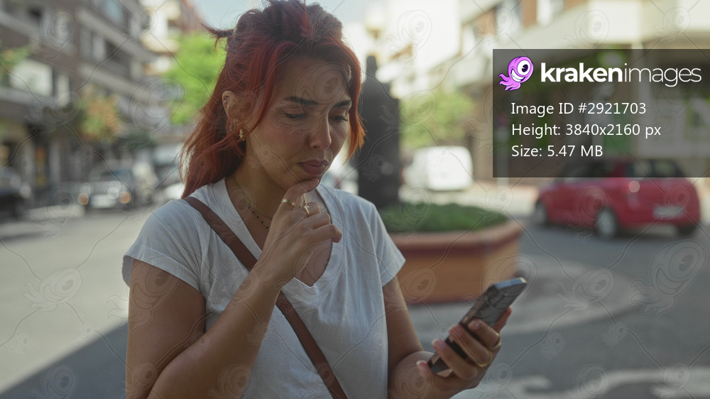 Woman tapping smartphone on city street plaza while scrolling with finger, crossbody bag visible and hand on chin in thoughtful pose; quiet contemplation. - Kraken Images