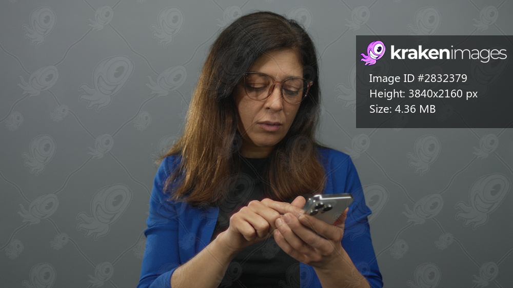 Woman tapping smartphone screen with finger in grey studio wearing glasses and blue jacket; concern.