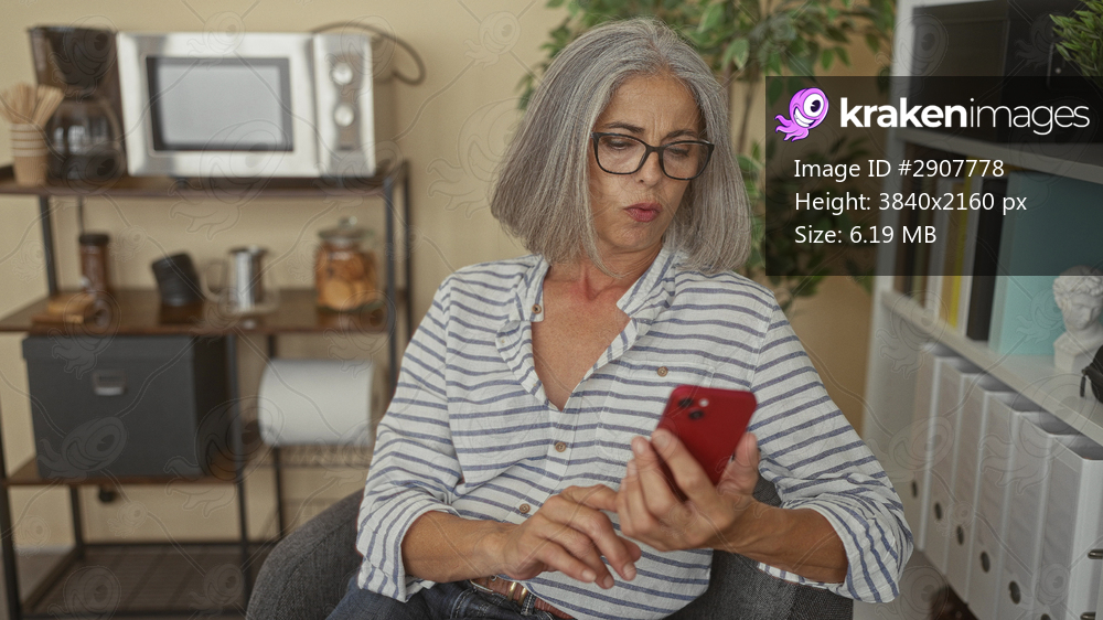 Woman tapping smartphone screen in office building wearing glasses and striped shirt; technology concern.