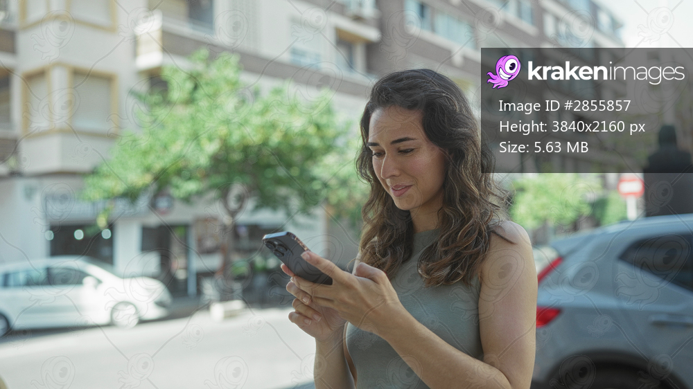 Woman tapping smartphone screen on urban street amid parked cars and city buildings in daylight; digital connection engagement curiosity.