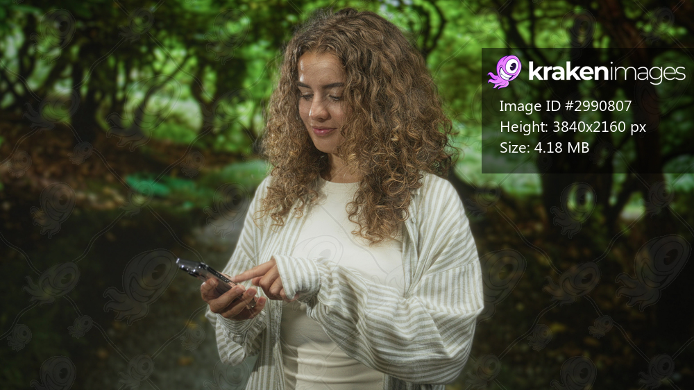 Woman tapping smartphone screen while adjusting sleeve and smiling on a forest path; serenity connection.
