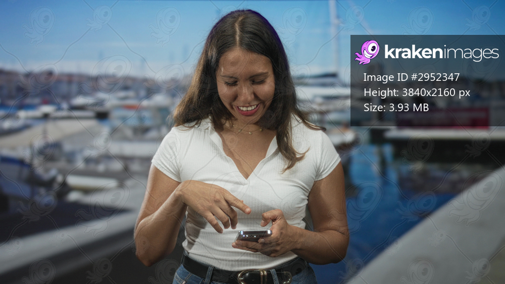 Woman tapping smartphone and smiling at port marina dock while holding phone with both hands; carefree summer joy.