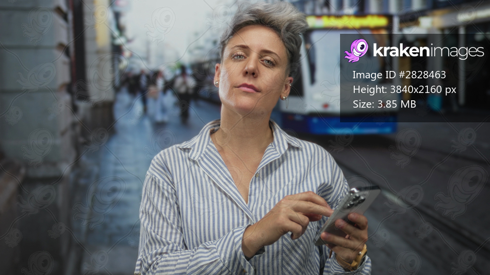 Woman tapping smartphone touchscreen with finger amid blurred pedestrians on busy city street; calm concentration.