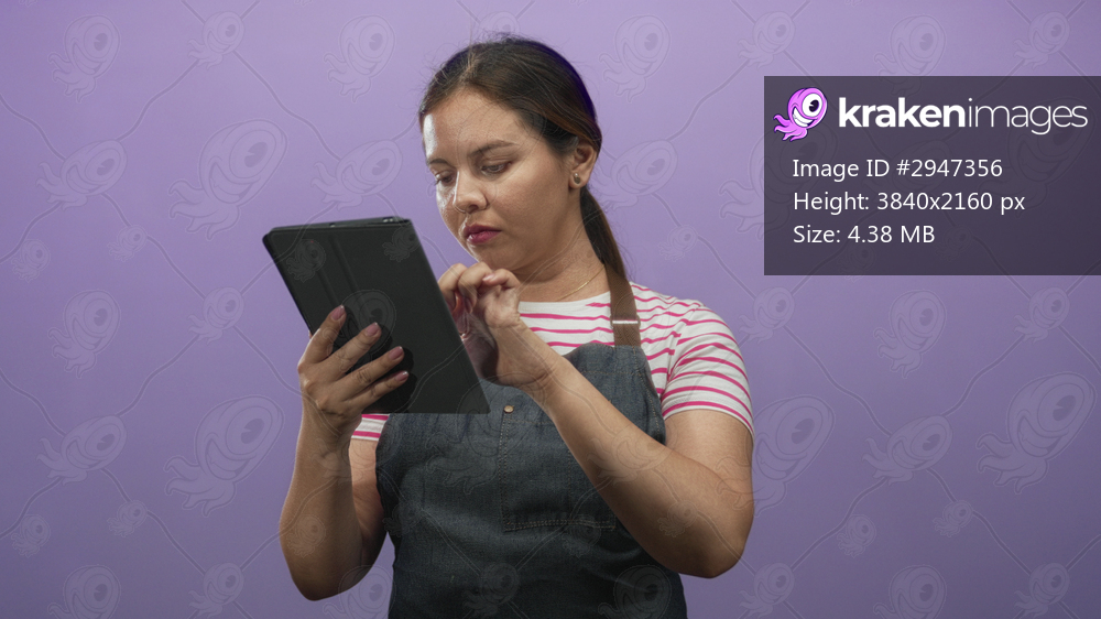 Woman tapping tablet with finger gestures in purple studio wearing denim apron and striped shirt; work concentration.