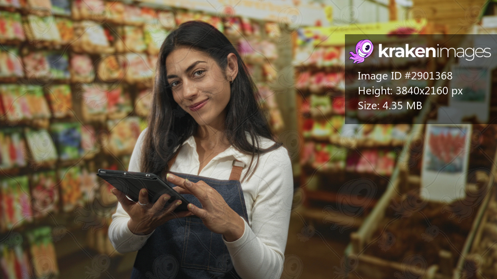 Woman tapping tablet with hands while checking seed packets and potted flowers at a shop building counter; serene productivity.