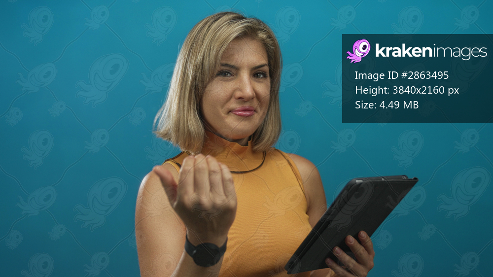 Woman tapping tablet screen with finger in blue studio; concentration engagement dedication productivity.
