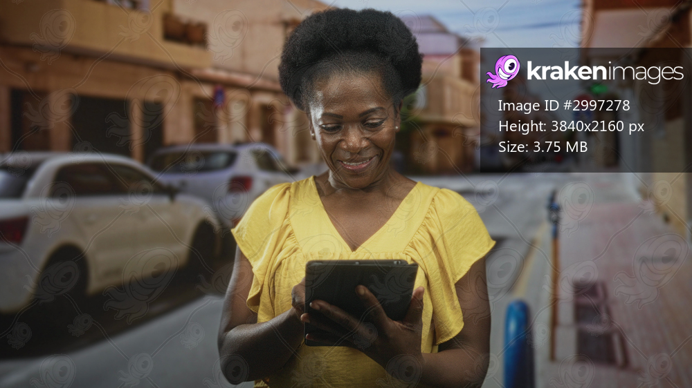 Woman tapping tablet screen with finger on street sidewalk near parked cars, wearing yellow dress; contentment focus.