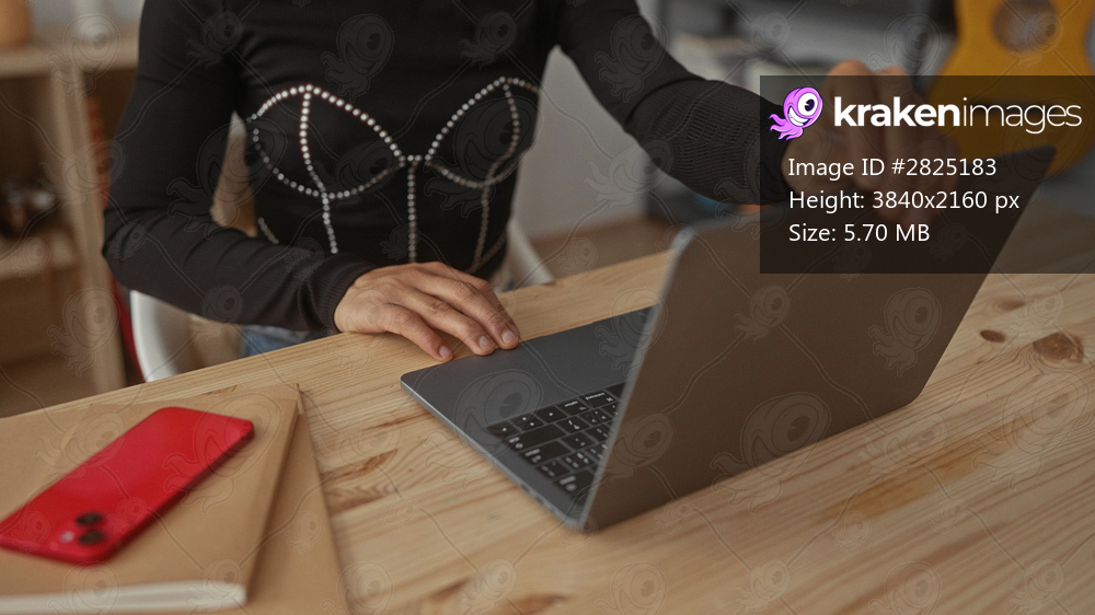 Woman taps keyboard with hands on laptop beside red smartphone on wooden desk in office building; focus productivity.