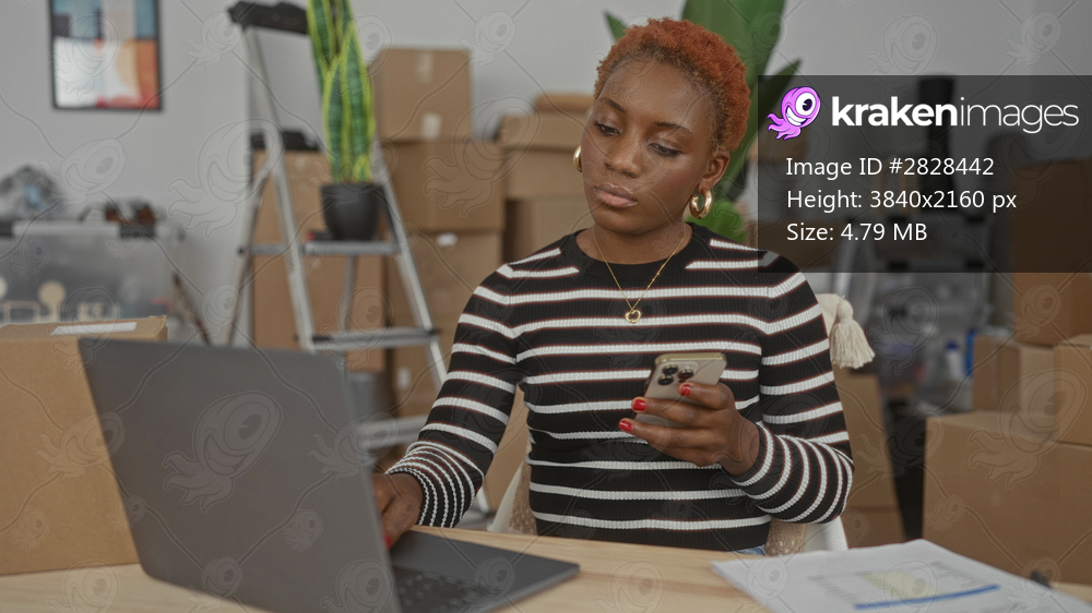 Woman taps smartphone beside laptop at wooden table in a building filled with moving boxes and ladder; focus planning move.