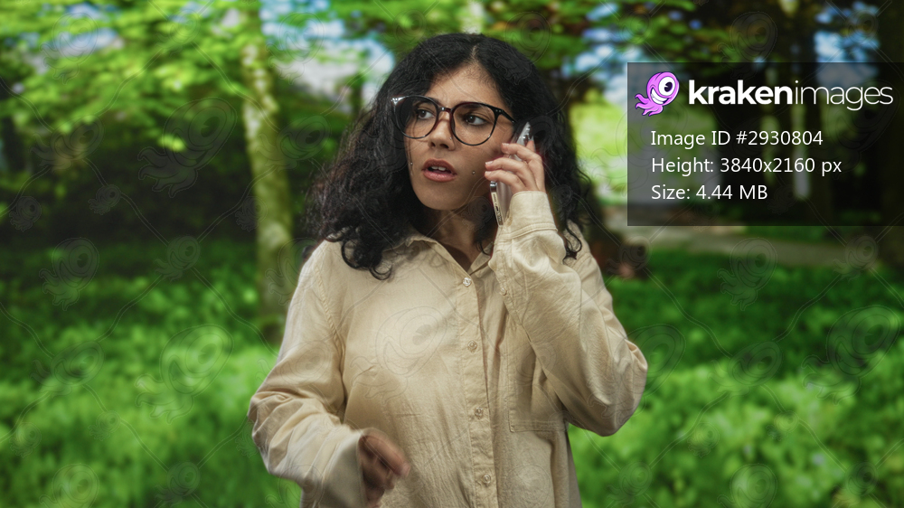 Woman taps smartphone in forest while looking down, wearing glasses and a loose beige shirt, hair curled at shoulders and a cheek piercing visible; quiet contemplation. - Kraken Images