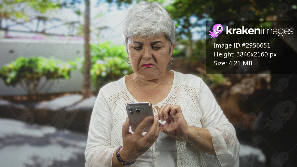 Woman taps smartphone screen with fingers in studio while looking down at display; technology frustration.