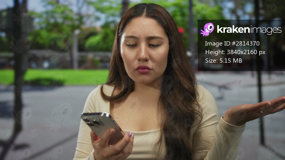 Woman taps smartphone screen with one hand and raises the other in a questioning gesture on street; frustration.