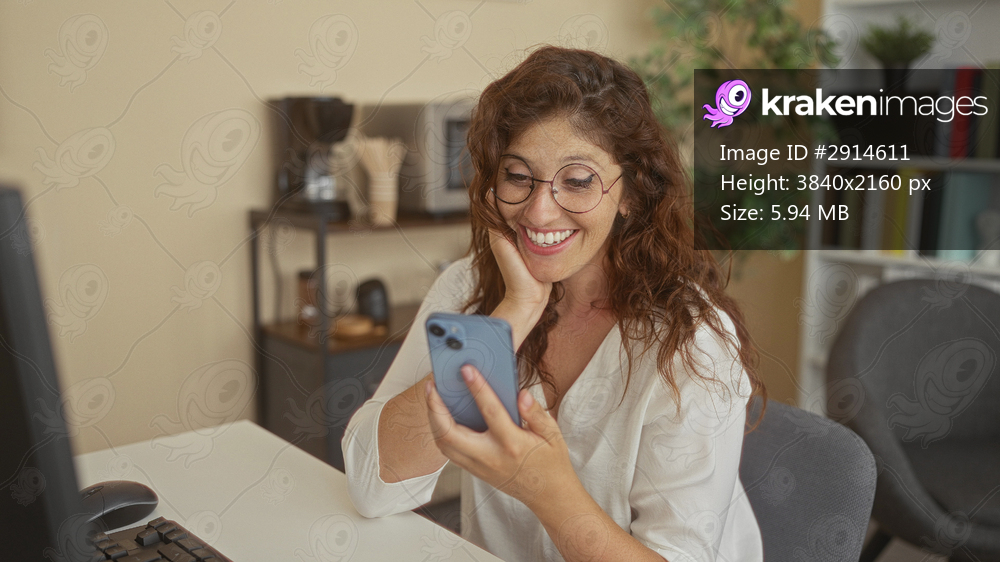 Woman taps smartphone while smiling at a building office desk, fingers on screen and holding phone near face; happiness and connection.
