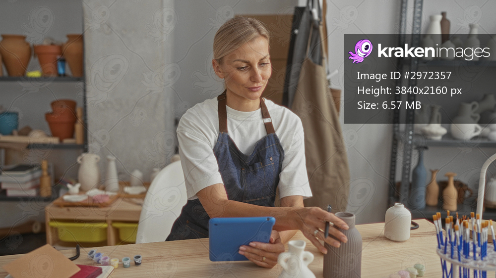 Woman taps tablet and holds ceramic vase with one hand while inspecting glaze and brushes on worktable in pottery studio; craft concentration.