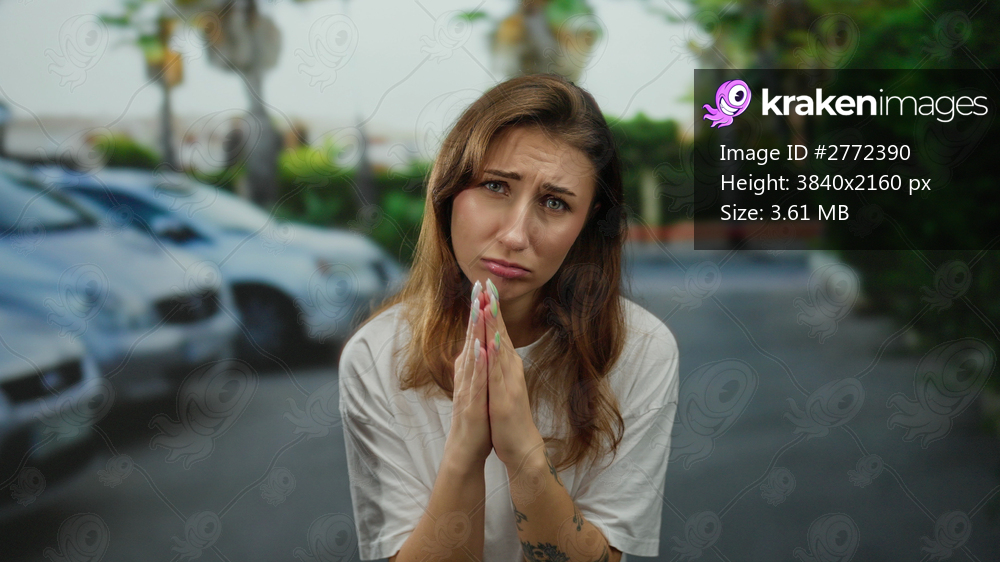Woman with tattoo and manicure pleading with sad expression in a city street with cars in background, conveying emotion and urban life.