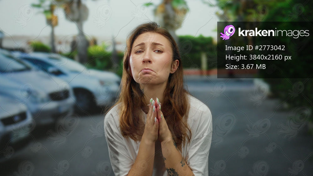 Woman with tattoo and manicure pleading with sad expression in a city street with cars in background, conveying emotion and urban life.