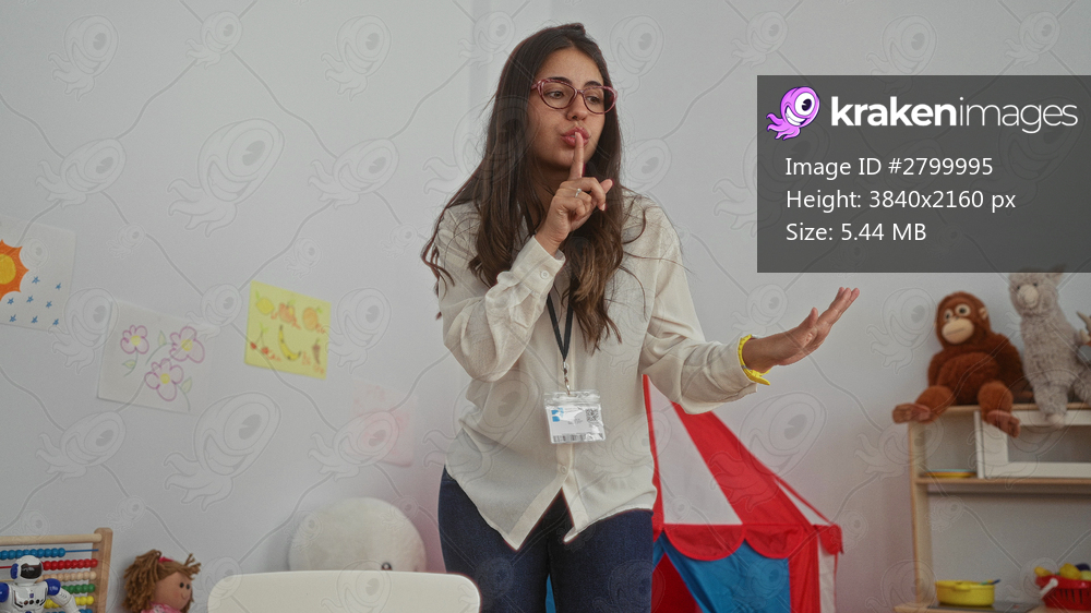 Woman teaching in a lively kindergarten setting with colorful toys and drawings, wearing glasses and a badge, emphasizing a nurturing educational environment. - Kraken Images